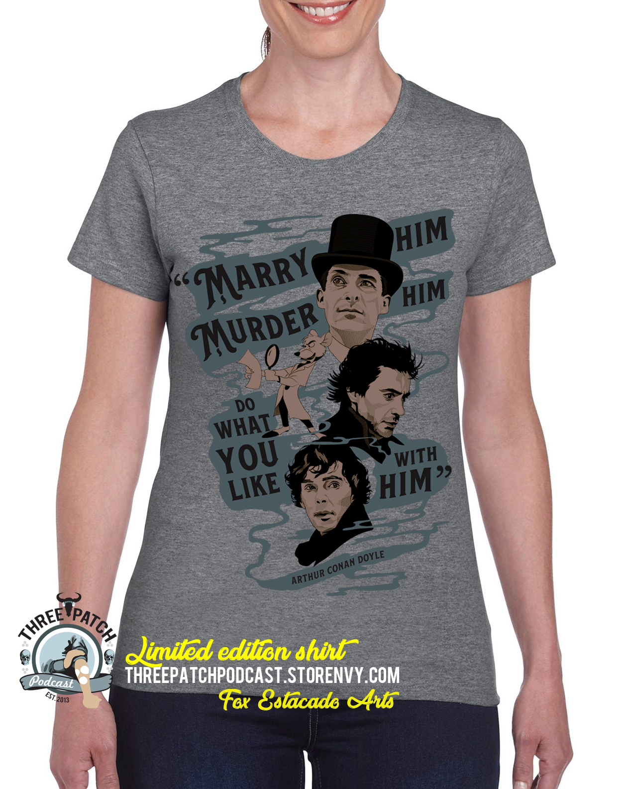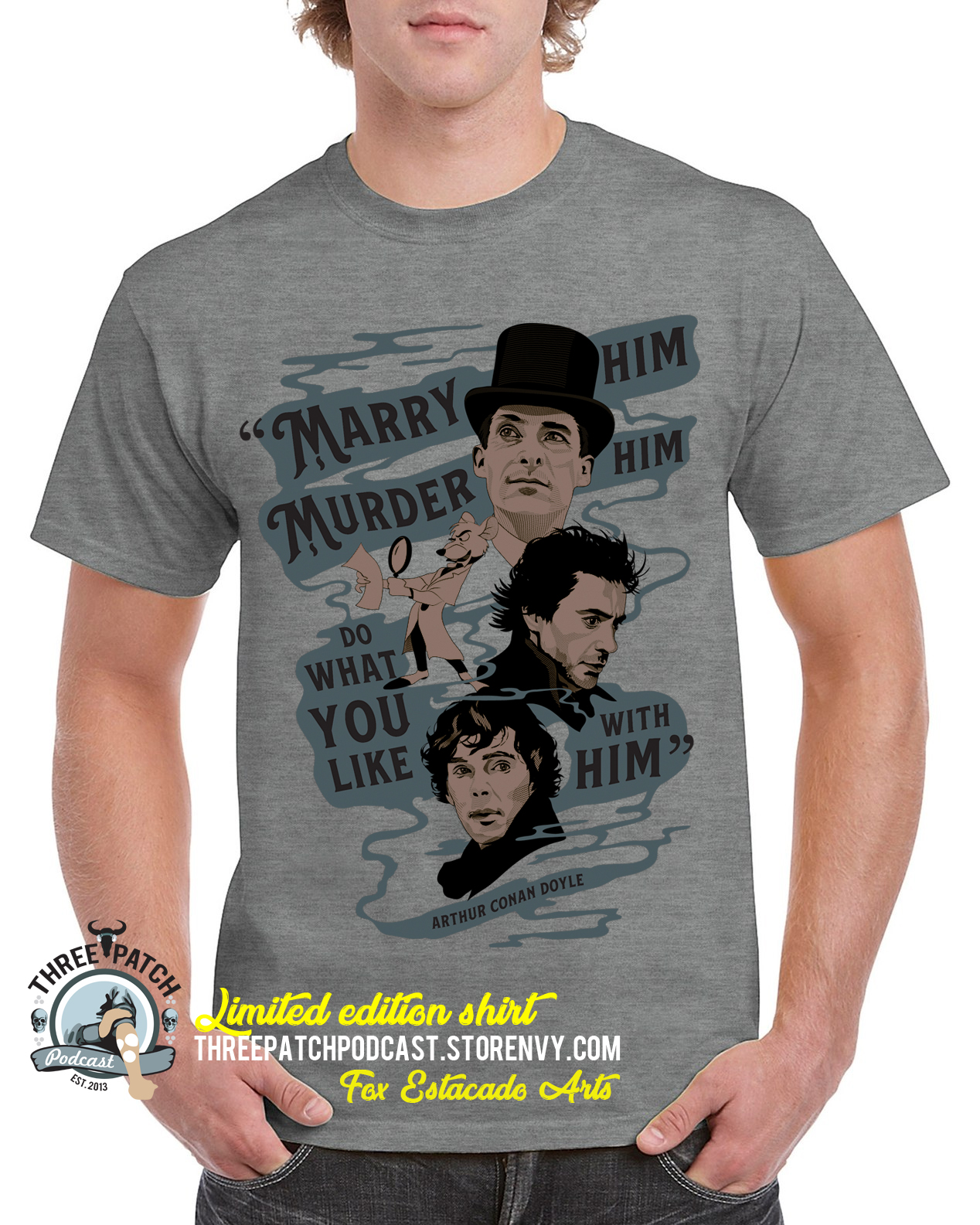 With “Marry him, murder him, do what you like with him” Arthur Conan Doyle gave blanket permission for us to do what we like with Sherlock Holmes! This shirt features art created by Fox Estacado, and all profits from online sales will be donated to Three Patch Podcast! However, this shirt is only available until March 31, 2019! Quantities are limited, purchase soon!